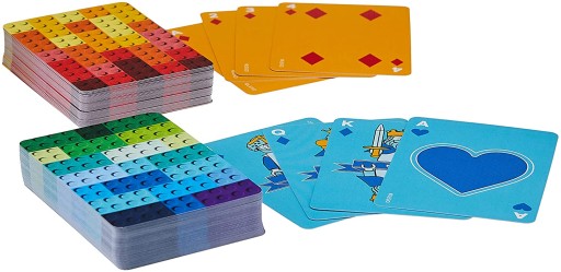 - zawiera dwie talie(2X54 karty) z kolorowymi wzorami klocków na rewersach