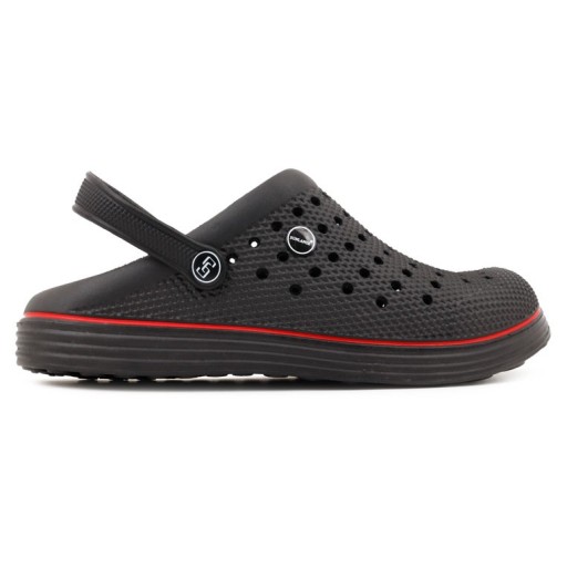Klapki męskie typu kroksy na płaskiej podeszwie z lamówka dookoła. Wsuwane, z okragłym noskiem. Ozdobione wyciętymi dziurami w kształcie kółek na cholewce. W tylnej części pasek dodatkowo trzymający stopę. W całości wykonane z gumowego tworzywa. Idealne na basem ja krównież na codzień.