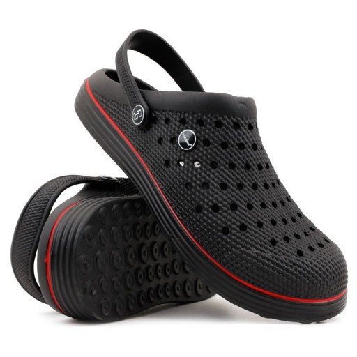 Klapki męskie typu kroksy na płaskiej podeszwie z lamówka dookoła. Wsuwane, z okragłym noskiem. Ozdobione wyciętymi dziurami w kształcie kółek na cholewce. W tylnej części pasek dodatkowo trzymający stopę. W całości wykonane z gumowego tworzywa. Idealne na basem ja krównież na codzień.