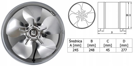 Wentylator osiowy o wymiarze fi 250 mm służy do przesyłania przepływu powietrza wewnątrz sieci kanałów wentylacyjnych. Nadaje się do użycia zarówno do średnich i dużych pomieszczeniach czy halach przemysłowych. Wentylator jest wytwarzany z stalowej blachy w kolorze srebrnym. Wentylator posiada stopień ochrony IPX2 oznacza to, że jest odporny na przedostawanie się wody przy kroplach opadających pionowo na urządzenie odchylone o 15o od położenia pionowego oraz I klasę izolacji, jest on więc chroniony przed dotykiem bezpośrednim, dzięki izolacji podstawowej. Wentylator przeznaczony do montażu ściennego ze względu na użycie łożyska ślizgowego. Wyprodukowany w Polsce i oparty na polskiej elektronice. Do zestawu dodatkowo dołączone są kable do zasilania.50-letnie doświadczenie firmy DOSPEL w produkcji to gwarancja najwyższej jakości.
