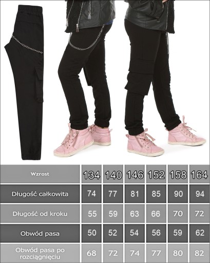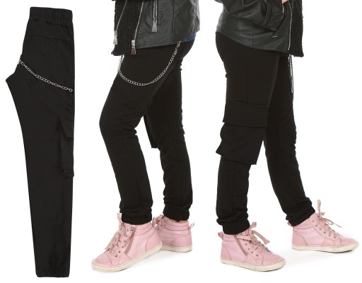 - Na jednej nogawce duża kieszeń z patką,całość dopełniona modnym dodatkiem w postaci metalowego dopinanego łańcuszka