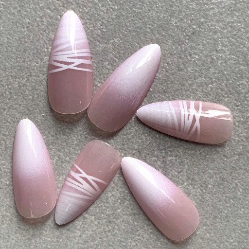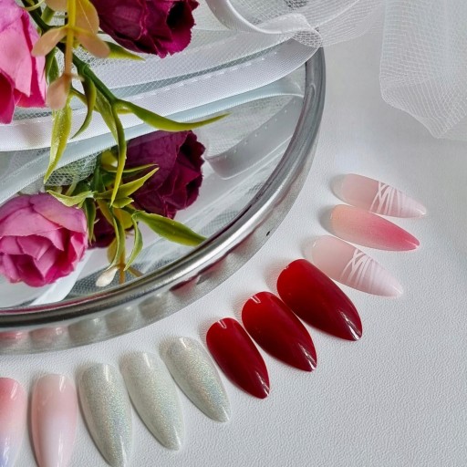 ✔️Wybrany model jest w pięknym błyszczącym kolorze z delikatnym motywem french. Paznokcie w kształcie stiletto.