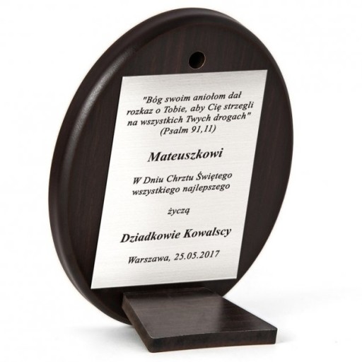 Dodatkowo mamy możliwość wykonania graweru na blaszce i umieszczeniu jej na rewersie obrazka. Skorzystaj z naszych wzorów lub stwórz własny oryginalny tekst graweru - usługa GRATIS.