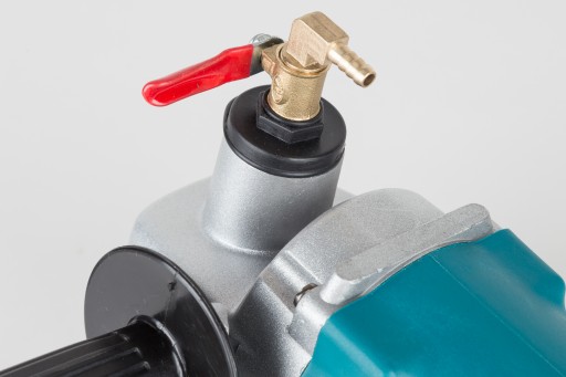 Szlifierka wyposażona w mosiężne złącze z zaworem do podłączenia węża doprowadzającego wodę.