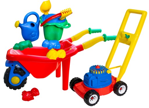 Duża taczka ogrodowa + komplet do piasku 9 elementów + kosiarka