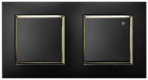 ZESTAW WŁĄCZNIK PODWÓJNY I KRZYŻOWY ARIA W KOLOŻE CZARNYM Z RAMKĄ PODWÓJNĄ I OBRAMÓWKĄ ZŁOTĄ. MONTOWANE W STANDARDOWYCH PUSZKACH FI60 ŁĄCZONYCH.