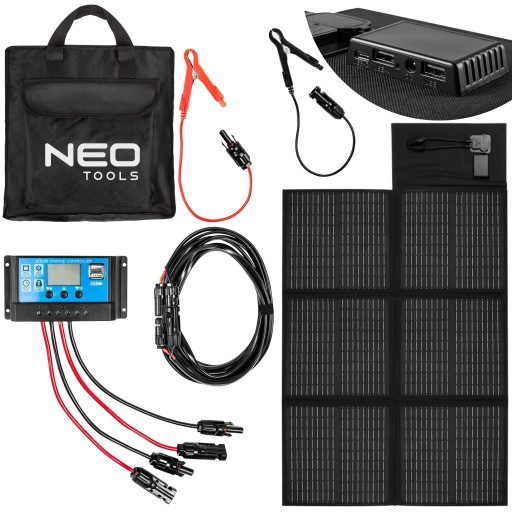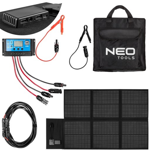 Panel słoneczny przenośny 120W 90-141 NEO oraz jednocześnie ładowarka solarna, umożliwiająca pobieranie energii słonecznej o mocy 120W. Urządzenie wyposażone jest w dwa wyjścia USB oraz dodatkowo jedno wyjście USB C. Dołączony do niego zestaw akcesoriów, umożliwia wygodne rozkładanie, transport oraz przechowywanie. Ładowarka przeznaczona jest do zasilania akumulatorów 12-voltowych, np. w łodziach czy pojazdach (samochód lub przyczepa kempingowa). Naładuje baterię telefonu, tabletu lub laptopa.