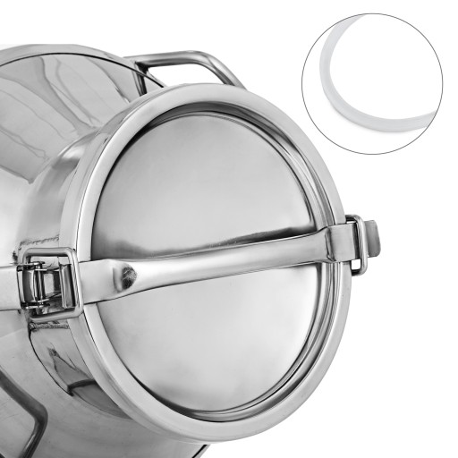 【USZCZELNIONA POKRYWA Z KLAMRAMI】-Uszczelniona pokrywa z jedną silikonową uszczelką spożywczą jest szczelnie zabezpieczona dwoma zatrzaskowymi klamrami, nie trzeba się martwić o wyciek mleka lub oleju, nawet gdy wiadro jest odwrócone. Możesz swobodnie nosić mleko w tym dzbanku tam iz powrotem ze stodoły do domu.