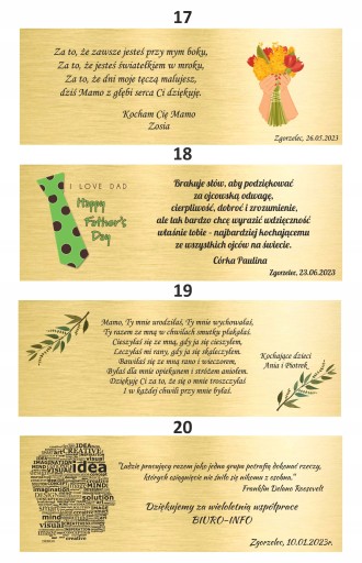 można skorzystać z naszych propozycji lub podać swój własny tekst i grafikę, jeżeli chcą Państwo użyć swojej grafiki należy ją najpierw do nas wysłać w wiadomości, a my sprawdzimy czy się nadaję do umieszczenia na tabliczce)