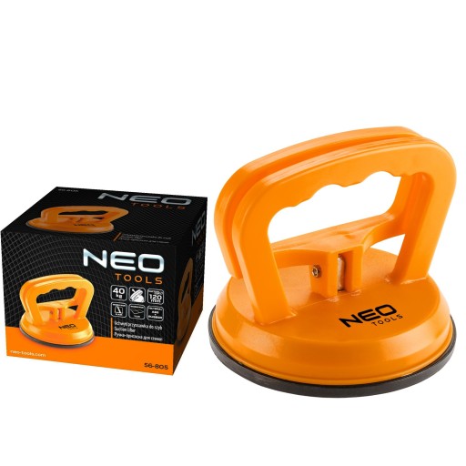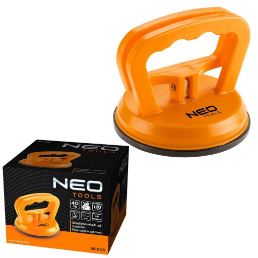 Przyssawka do szyb pojedyncza, 40 kg, 56-805 marki NEO to narzędzie przeznaczone do przenoszenia materiałów o płaskiej oraz gładkiej powierzchni. Doskonale sprawdzi się w transporcie szyb (okiennych lub samochodowych), blaszanych arkuszy, płytek ceramicznych lub laminatów. Podstawa wykonana jest z gumy, z kolei zatrzaski zrobiono z wysokiej jakości tworzywa sztucznego. Średnica przyssawki wynosi 120 mm, a jej udźwig określa się na poziomie do 40 kg.
