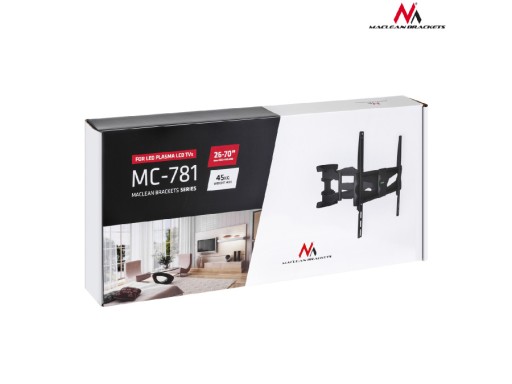 Uniwersalny uchwyt ścienny Maclean MC-781 służy do montażu telewizorów LCD, LED i plazmowych oraz monitorów różnych marek o wadze do 45kg i o wymiarach przekątnej ekranu od 26” do 70”. Kompatybilny z telewizorami LED, LCD, PLAZMA: Sony, LG, Samsung, Philips, Sharp, Panasonic, Toshiba, Grundig, Pioneer, JVC, Benq, Sanyo, NEC, Hyundai, Hitachi.