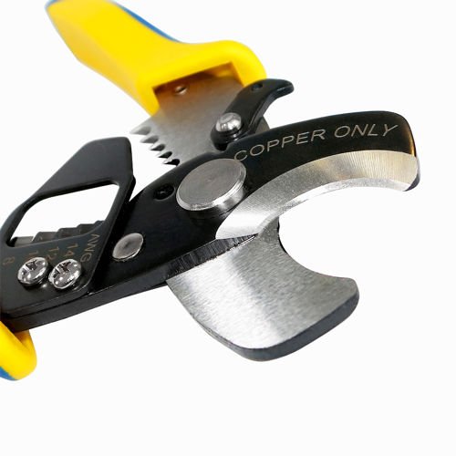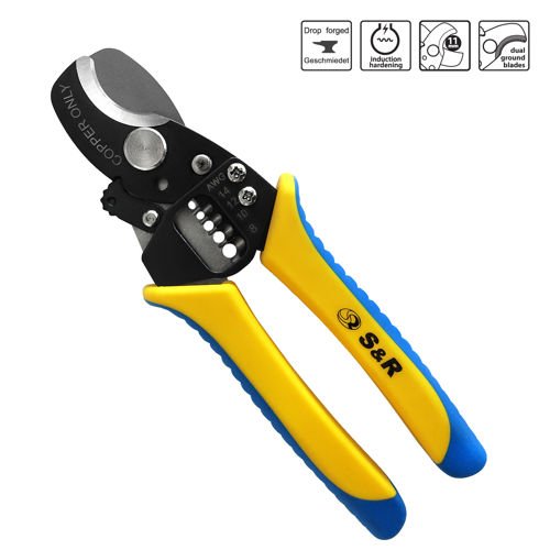 Nożyce do kabli ze ściągaczem izolacji S&R 170 mm, przeznaczone są do kabli miedzianych i aluminiowych. Posiadają rozwierane szczęki ze sprężyną oraz blokadą otwarcia. Precyzyjne ostrze zostało wykonane ze stali SK5. Po obróbce ostrzenia zostało zahartowane indukcyjnie. Bardzo wygodna dwukomponentowa rękojeść ułatwia pracę i niweluje zmęczenie podczas długotrwałego użytkowania.