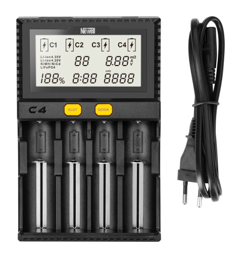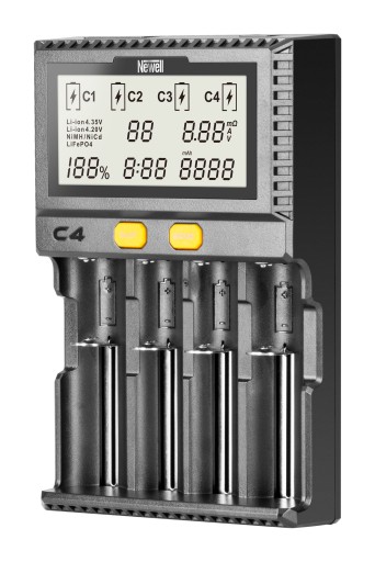 Newell C4 Supra to uniwersalna ładowarka, kompatybilna z większością cylindrycznych akumulatorów dostępnych w sprzedaży. Wyświetlacz LCD pokazuje napięcie, natężenie, czas ładowania, opór wewnętrzny oraz procentowy stan naładowania ogniwa – wszystko to pozwala z łatwością określić parametry i status procesu. Specjalnie zaprojektowana obudowa pozwala na jednoczesne ładowanie nawet największych akumulatorów (typu C lub 22650) we wszystkich czterech kanałach jednocześnie.