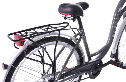 - Wyposażenie - błotniki, bagażnik wzmacniany, odblaski, dzwonek, oświetlenie LED bateryjne, podpórka, kosz na klik wiklinowy