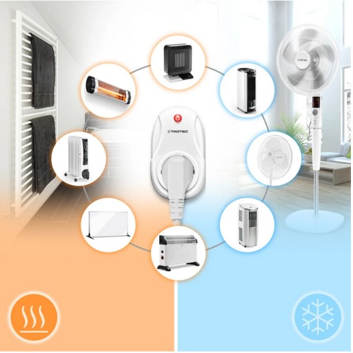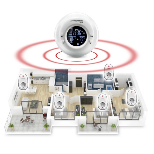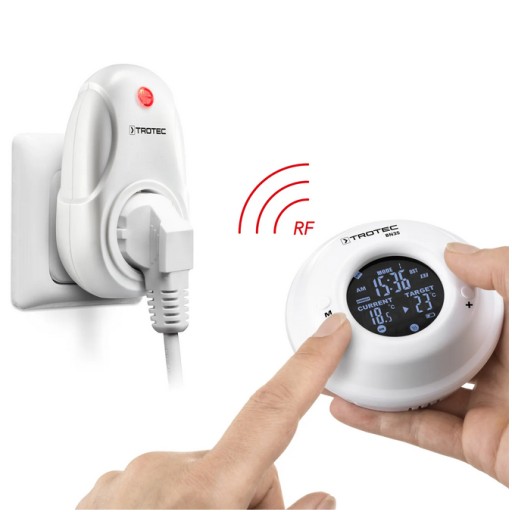 Za pomocą termostatu radiowego można bezprzewodowo sterować aż 100 radiowymi gniazdami sieciowymi. Z termostatem radiowym mają jednoczesny kontakt wszystkie radiowe gniazda sieciowe znajdujące się w promieniu ok. 20 metrów. Ma to idealne zastosowanie np. w szklarniach lub halach. Przeznaczone do niego radiowe gniazda sieciowe typu BN35R dostępne są w Trotecu jako oddzielne akcesorium.