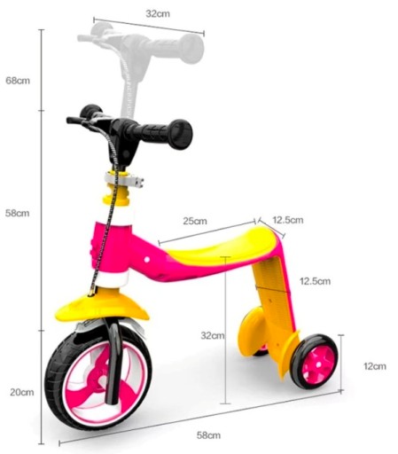 - maksymalne obciążenie: hulajnoga 50kg, jeździk 40kg