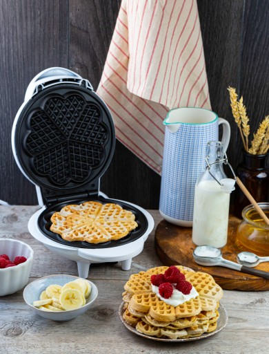 Gofrownica o mocy 1000 W z termostatem. Doskonała do przygotowywania chrupiących gofrów. Jednocześnie opieka 5 gofrów w kształcie serduszek. Zaopatrzona w płyty grzewcze pokryte powłoką zabezpieczającą przed przywieraniem, co ułatwia czyszczenie. Gofrownica wykonana w przyjemnym białym kolorze.