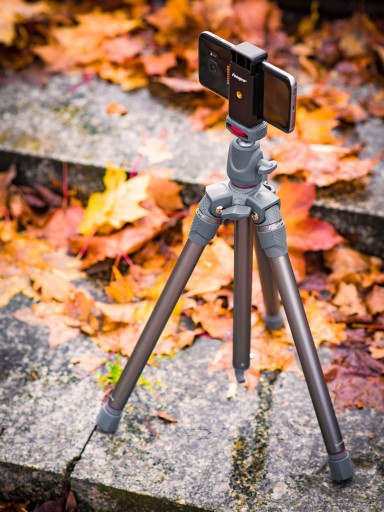 Wraz ze statywem w opakowaniu znajduje się mocowanie do smartfonów, adapter do systemu GoPro, dwa klucze imbusowe oraz praktyczne etui.