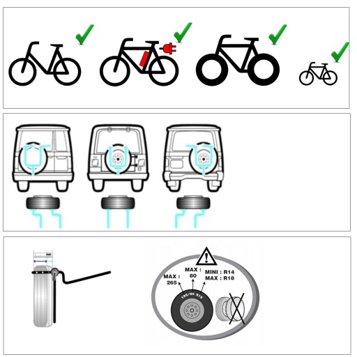 Uchwyt rowerowy Rider pasuje do większości pojazdów terenowych z kołem zapasowym na tylnej klapie typu SUV, 4x4, off-road. Nie ważne czy koło jest umieszczone na środku klapy, czy też z boku, ten produkt może być zamontowany w każdych warunkach. Do tego bagażnika pasuje również prawie każdy rower m.in. męski, damski (damka), górski (góral), dziecięcy, miejski i wiele innych.