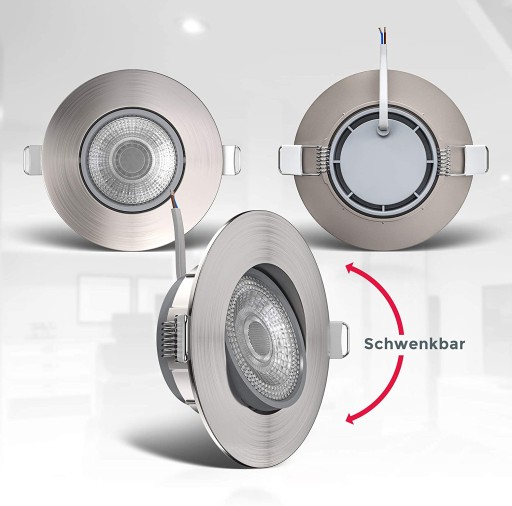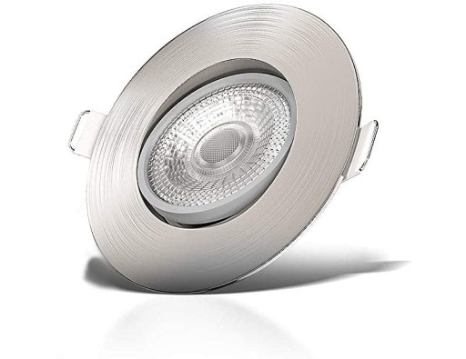 Zestaw 6x Oprawka wpustowa - Downlight - w lampie zastosowano wysokiej jakość moduł LED o mocy 5W i barwie światła ciepłej 3000k dzięki któremu głębokość montażowa zmniejszyła się do zaledwie 3 cm. Oprawka w kolorze nikiel mat. Dodatkowym atutem jest to że oprawa jest uchylna oraz możne współpracować ze ściemniaczem