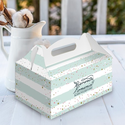 Pudełko na ciasto na komunię. Do samodzielnego złożenia. Wykonane ze sztywnego papieru. Na pudełku widnieje napis "I Komunia Święta, Słodkie podziękowanie"