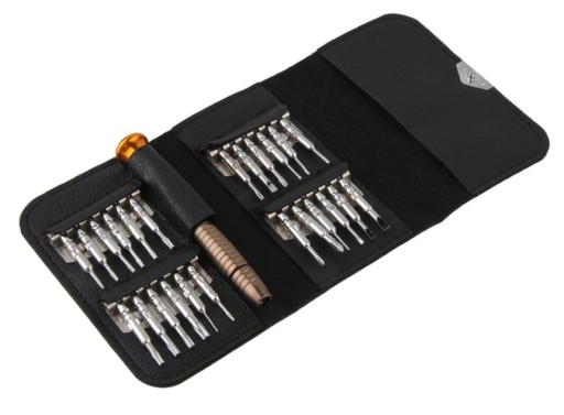Zestaw wkrętaków precyzyjnych 25w1. Nadaje się do napraw większości produktów cyfrowych, różnych typów komputerów, telefonów komórkowych, aparatów fotograficznych, okularów, zegarków oraz innych prac gdzie wymagana jest duża precyzja. Całość umieszona w poręcznym etui z ekoskóry. W zestawie znajdują się 24 końcówki: