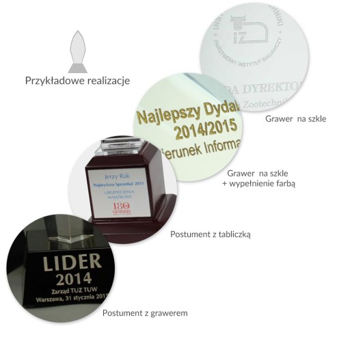 Zachęcamy Państwa do spersonalizowania statuetki poprzez wykonanie trofeum z grawerem. Proszę przesłać mailem treść, która ma zostać wygrawerowana bądź logotyp/grafikę w wersji wektorowej, a my przygotujemy projekt statuetki.