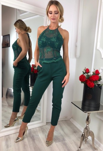 Elegancki kombinezon z długimi nogawkami Unikatowe rozwiązanie kombinezon wiązany jest na szyi sznureczkiem. Materiał elegancki idealnie nadaje się na specjalne okazje. Produkcja polska.