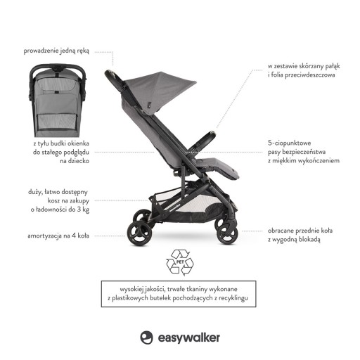 Marka Easywalker koncentruje się na tworzeniu wózków, doskonale pasujących do rodzicielskiej codzienności i zachęca do odkrywania świata razem z dzieckiem. Idea wózka, odpowiedniego do życia zarówno w mieście, jak i w podróży, zaowocowała powstaniem modelu Miley² – wyjątkowo kompaktowej, lekkiej i świetnie wyposażonej spacerówki, łączącej wyrafinowany design z wygodą, łatwością korzystania i... dbałością o środowisko! Wysokiej jakości tkaniny są bowiem wykonane z surowców wtórnych.