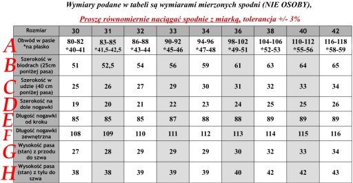 - W celu doboru odpowiedniego rozmiaru proszę zapoznać się szczegółowo z tabelą rozmiarów, i porównać ze swoimi spodniami, które są dobre. Proszę nie sugerować się rozmiarem z metki, różni producenci stosują różne rozmiarówki. Wszystkie pomiary i zdjęcia są mojego autorstwa i przedstawiają realny produkt, aktualizowane dla każdej nowej partii towaru.