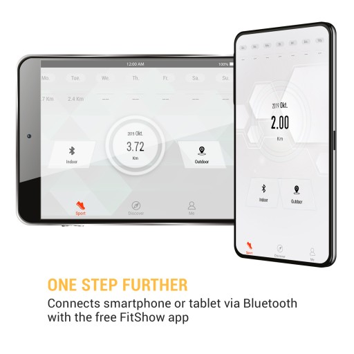 - Jeden krok dalej: możliwość połączenia smartfonu lub tabletu przez Bluetooth z bezpłatną aplikacją FitShow