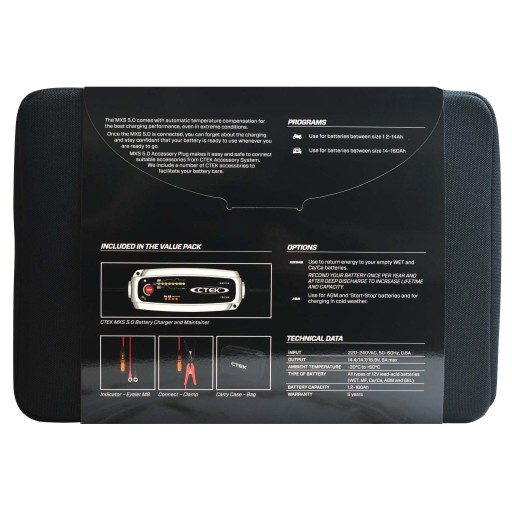 CTEK MXS 5.0 to zaawansowana ładowarka sterowana mikroprocesorem z wbudowanym czujnikiem temperatury. Funkcje ładowarki MXS 5.0 rozwiązują szeroki zakres problemów związanych z akumulatorami, dzięki czemu urządzenie doskonale nadaje się dla wymagających użytkowników. MXS 5.0 sprawdza, czy akumulator może utrzymać ładunek.