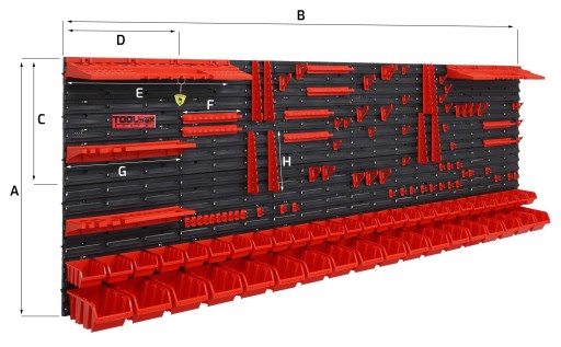 Warsztatowa tablica narzędziowa z pojemnikami i uchwytami Toolbox System Wall Mix 240x80 do dowolnej aranżacji przestrzeni garażowej, warsztatowej lub magazynowej.