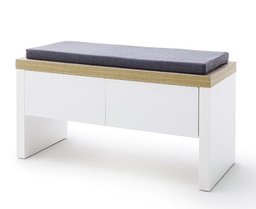 Pochodzi z kolekcji mebli do przedpokoju Ermo. Ławka została wykonana z wysokiej jakości płyty foliowanej w kolorze białym, blat w odcieniu dąb wotan. Posiada dwie praktyczne szuflady, które umożliwiają bezpieczne przechowywanie akcesoriów czy dodatków garderobianych. Wraz z innymi meblami z serii Ermo możesz stworzyć gustowną, elegancką garderobę w nowoczesnym designie.