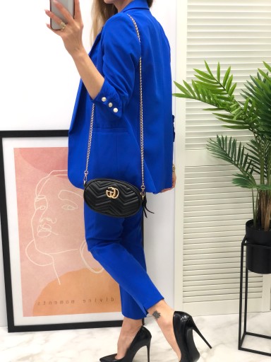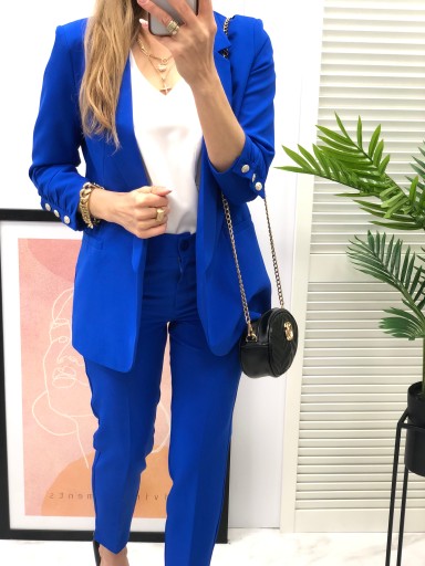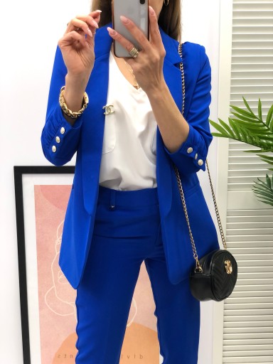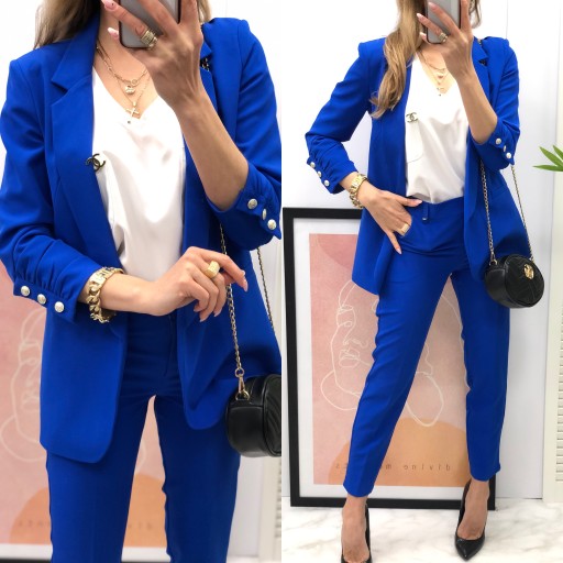 Markowy garnitur wykonany z eleganckiego materiału będący idealną alternatywą dla sukienki.