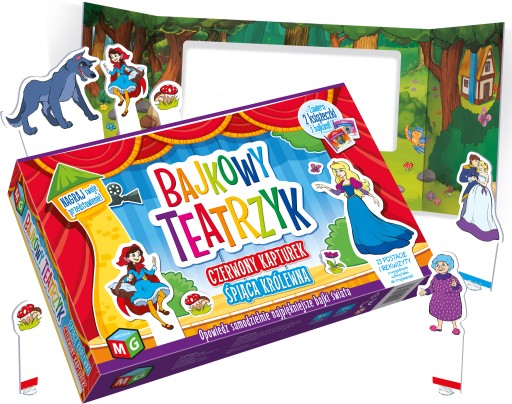 Rekwizyty rozstawione, aktorzy naszykowani, a do Twoich uszu dochodzą szepty widowni, czekającej, aż rozpocznie się przedstawienie! Scena teatru ma w sobie magię, która od setek lat przyciąga ludzi niczym magnes! Spróbuj skosztować odrobiny tych czarów i wystaw dla rodziny i przyjaciół piękne ponadczasowe bajki - "Czerwonego Kaptura" i "Śpiącą Królewnę". Przeczytaj książeczki z tymi historiami, a następnie użyj swojej wyobraźni, aby za pomocą załączonych postaci ożywić opowieści na scenie! Twórz własne dialogi, baw się ruchem bohaterów, ożywiaj ich swoim głosem, a także... wymyśl własną wersję przedstawionych wydarzeń? Zaufaj swojej wyobraźni i ruszaj na scenę!