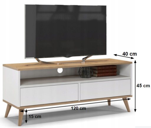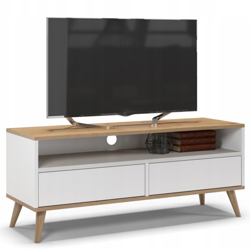Biała Szafka RTV Pod Telewizor z Elementami Drewna Stolik 2 Szuflady Półka