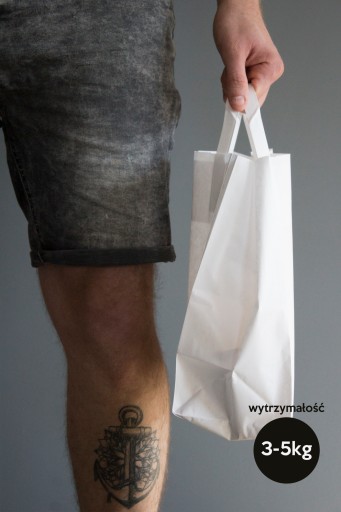 Torby papierowe z uchwytem płaskim wykonane są z białego papieru KRAFT, uchwyty toreb klejone wewnątrz toreb.