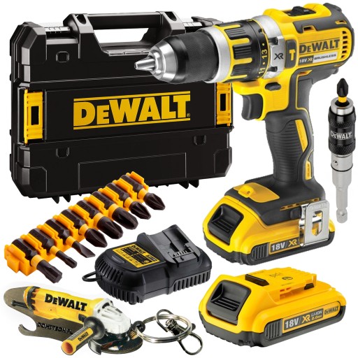 Wiertarko-wkrętarka dostarczana wraz z zestawem bitów udarowych, uchwytem na bity oraz otwieraczem w kształcie szlifierki DeWalt!