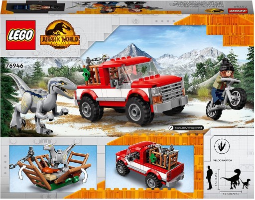 Ten inspirowany filmem „Jurassic World Dominion” zestaw zawiera furgonetkę do zbudowania, motocykl i zamykaną klatkę dla dinozaurów, a także nóżkę kurczaka służącą za przynętę. Zawiera również dwie minifigurki Maisie i Rainna Delacourta z bronią ze środkiem usypiającym oraz figurki dinozaurów Blue i Bety, które zachęcają dzieci do odgrywania ról i wymyślania własnych historii. W pudełku znajdują się proste instrukcje, dzięki którym nawet nowicjusze samodzielnie zbudują model. Ponadto zestaw świetnie łączy się z innymi zabawkami konstrukcyjnymi LEGO Jurassic World, dzięki czemu zabawa może być jeszcze lepsza.