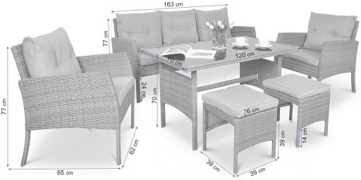 - w skład kompletu wchodzi funkcjonalna 3-osobowa sofa, 2 fotele z poduchami, 2 pufy oraz duży, prostokątny stół