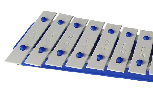 Płytki instrumentu są w kolorze białym z oznaczeniem słownym i literowym dźwięków, podstawa w kolorze niebieskim. Całość wykonana z bezpiecznego tworzywa.