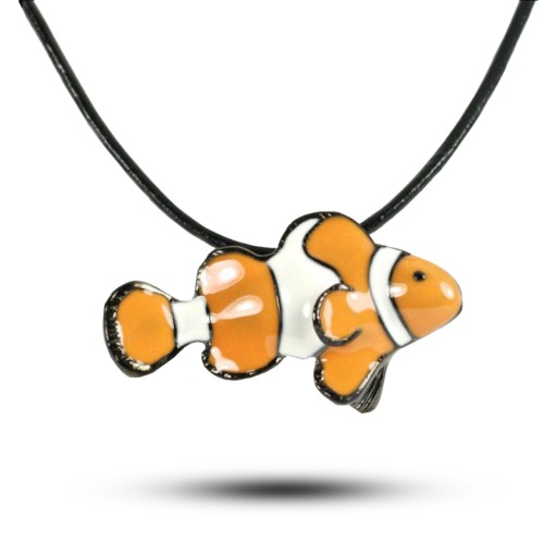 Zawieszka w kształcie rybki Nemo o bardzo realistycznych kolorach. Wykończenie czarnym hematytem i cyną. Skurzany rzemyk o długości 46,5cm z metalowym zapięciami. Zaprojektowany przez Rolanda St. John i wykonany w USA. Naszyjnik wykonany ze stopu cyny (nie śniedzieje, nie wyciera się, nie czernieje). Artysta ze szczególną troską zadbał o detale. Wielkość rybki: 4,5 cm x 2,5 cm.