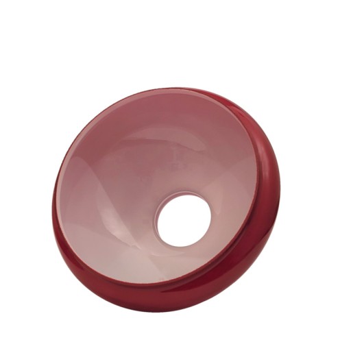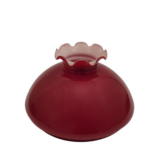 Klosz wykonano ręcznie ze szkła białego opalowego z falbankami malowanego na czerwony kolor. Jest to klosz typu aladyn odpowiedni jako zastępczy klosz do różnego typu lamp naftowych.