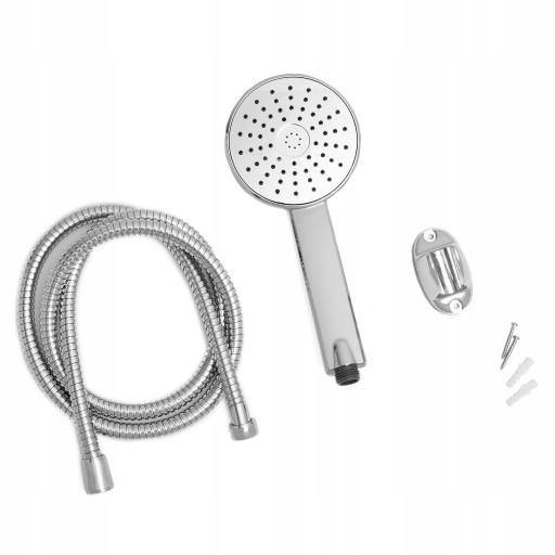 Jednofunkcyjna, okrągła słuchawka prysznicowa w zestawie z wężem oraz uchwytem ściennym. Wykonana została z twardego i wytrzymałego tworzywa, pokrytego warstwą chromu.