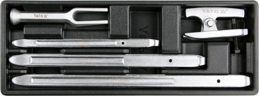 Wkład do szuflady zawierający zestaw łyżek do opon oraz dwa ściągacze do końcówek drążków kierowniczych.