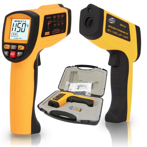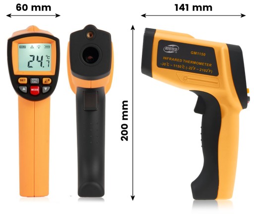 Wysokiej jakości termometr bezkontaktowy marki Benetech o zakresie temperatur od -30 do +1150 °C.Urządzenie wyposażone jest w celownik laserowy, który umożliwia precyzyjne nacelowanie badanego punktu. W urządzeniu zastosowano dobrej jakości materiały, a ergonomiczna budowa poprawia wygodę użytkowania termometru. Podświetlany wyświetlacz umożliwia pracę z urządzeniem w ciemności. Pirometr wyposażony jest w funkcję automatycznego wyłączenia zwiększając oszczędność w zużyciu baterii.