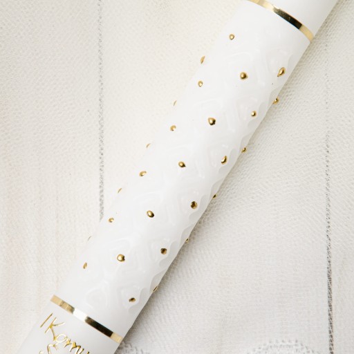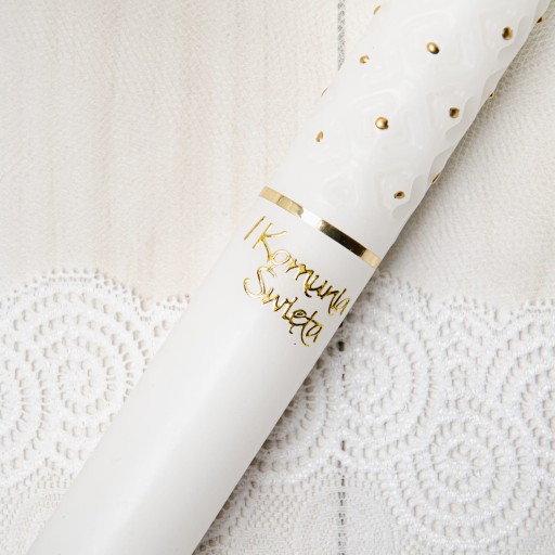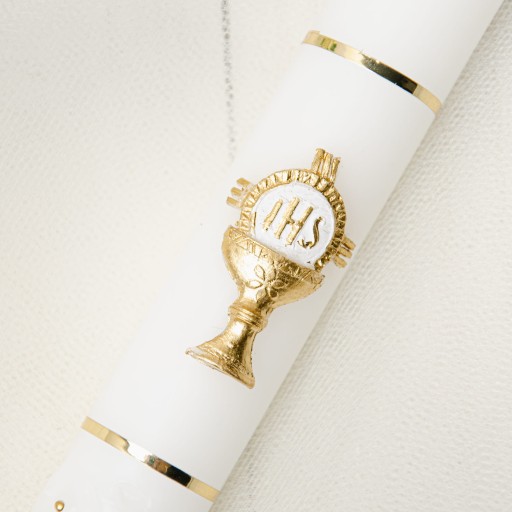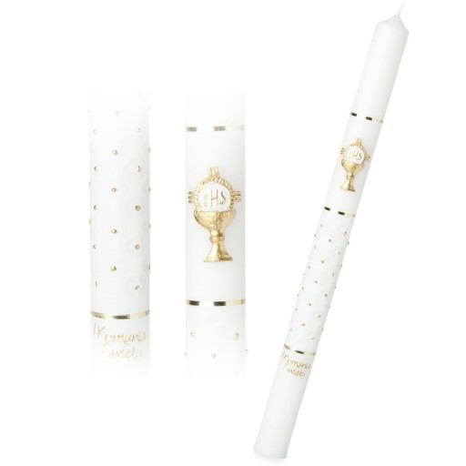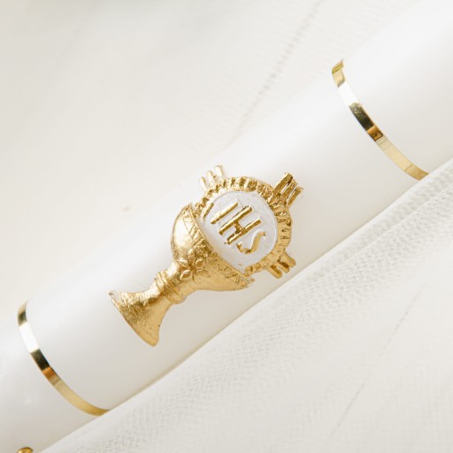 Piękna świeca komunijna ręcznie ozdabiana z motywem kielicha i Hostii. Uroku dodaje jej element dekoracyjny w postaci tłocznia. Gromnica utrzymana w biało-złotej tonacji. Uniwersalna kolorystyka sprawia, że świeca będzie stanowić doskonałą Pamiątką I Komunii Świętej zarówno dla chłopca, jak i dla dziewczynki.