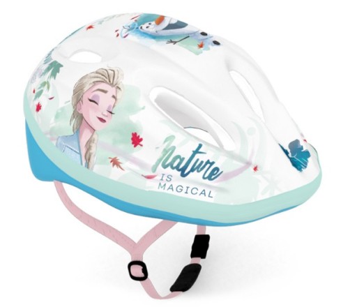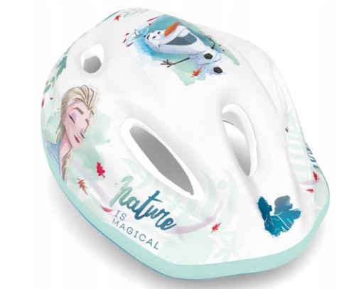 Kask dziecięcy z postaciami z bajki Frozen 2 jest przeznaczony dla dzieci jeżdżących na rowerze, rolkach, wrotkach, hulajnodze itp. Na zewnątrz pokryty jest warstwą PVC z kolorowymi wzorami przedstawiających bohaterów z bajek Disney.
