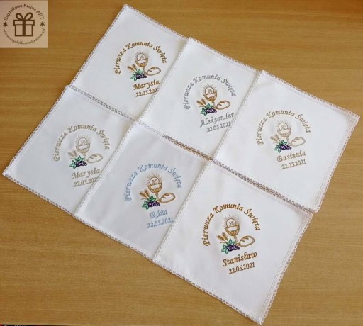 Wyjątkowa chusteczka z Twoim indywidualnym haftem (imieniem dziecka, datą I Komunii Świętej, grafiką)